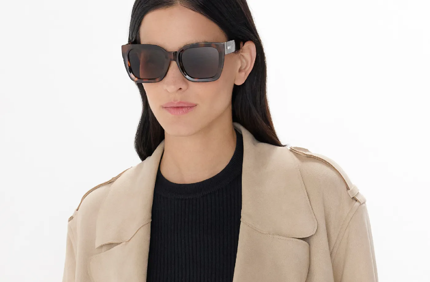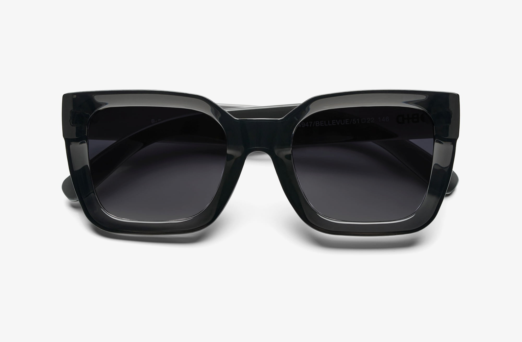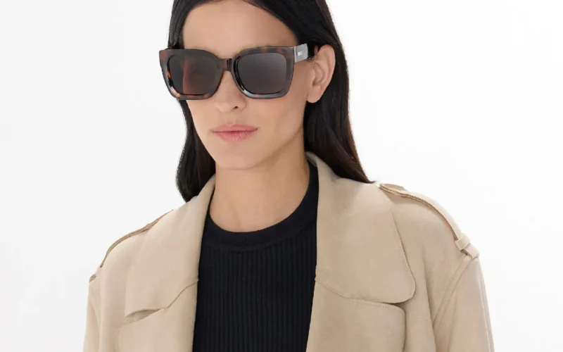 Γυαλιά ηλίου σε τετράγωνο σχήμα, γενναιόδωρο μέγεθος και κομψή λάμψη.